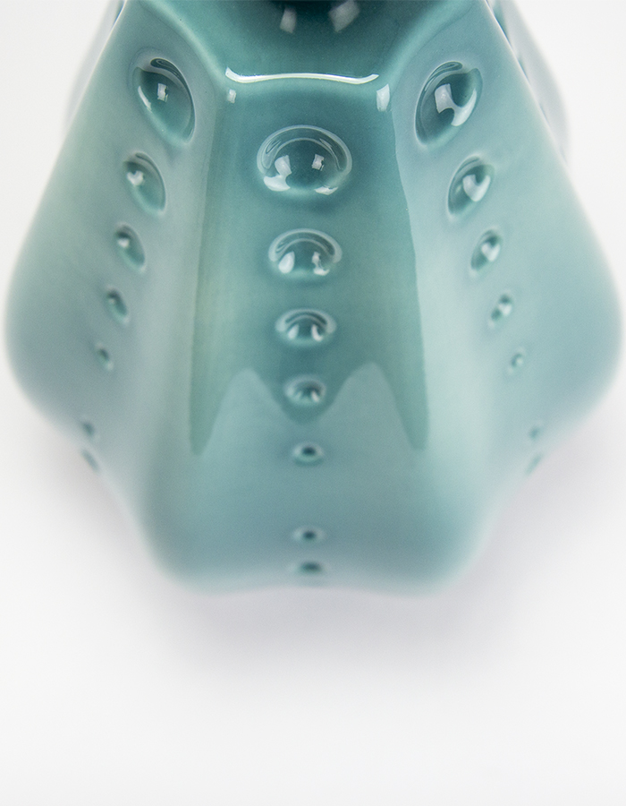 Le curve delle forme organiche morbide sono in contrasto con gli effetti della luce, che produce riverberi sulle superfici smaltate. Il processo artigianale di spugnatura e smaltatura della ceramica conferisce alla collezione un carattere davvero unico.